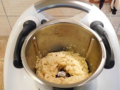 mettre dans le bol, les pommes, les oeufs, le sucre roux- puis mixer 4 secondes à vitesse 4